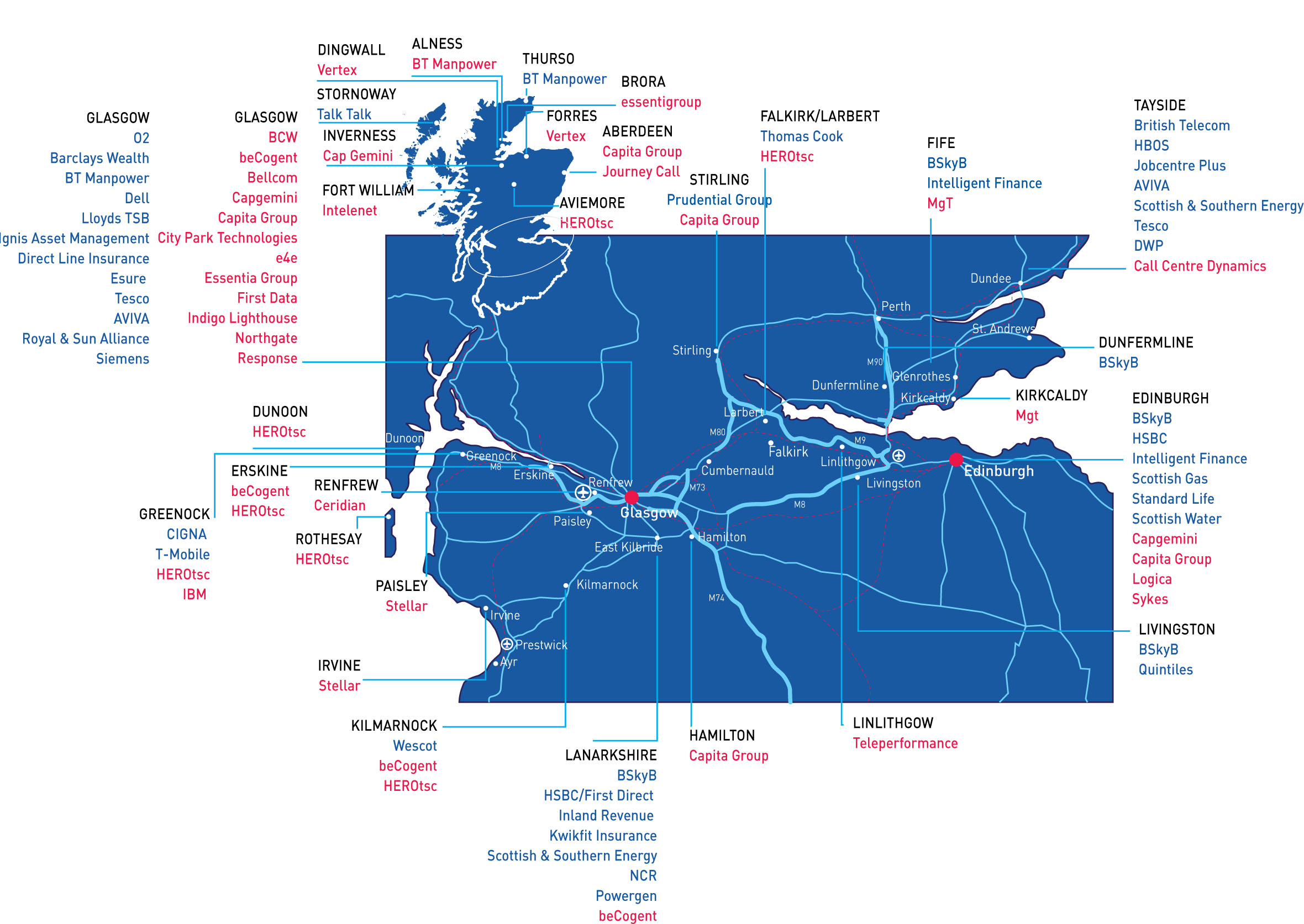 The image below illustrates the breadth of customer contact centres operating within Scotland.