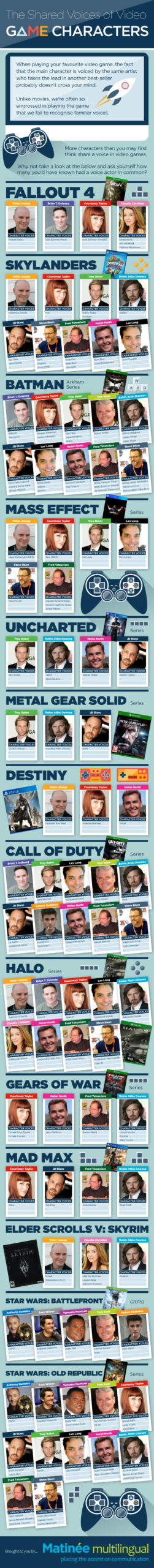 Here at Matinée Multilingual, one of the UK’s leading voice over agencies, we love working on video games and, as such, recently put together this infographic which looks at The Shared Voices of Video Game Characters. How many characters did you already know were voiced by the same artist?